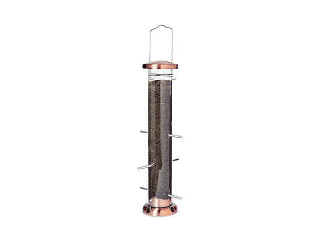 This feeder comes with 4 port. Metal copper color top and base. 1.5 lbs thistle seed capacity comes fully assembled and ready to hang. Easy to fill and clean.