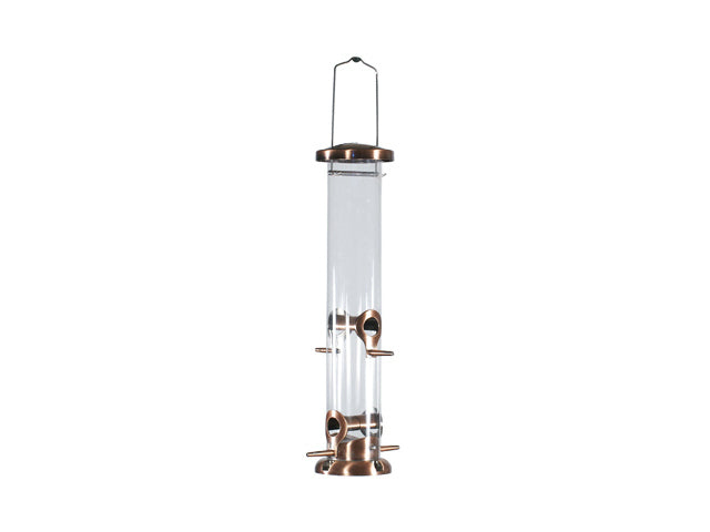 This feeder comes with 4 port. Metal copper color top and base. 1.5 lbs mixed seed capacity comes fully assembled and ready to hang. Easy to fill and clean.