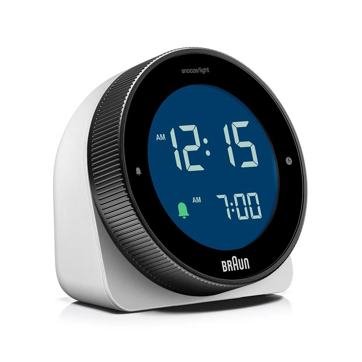 Features touch sensitive keys and a rotating bezel for setting time and alarm.