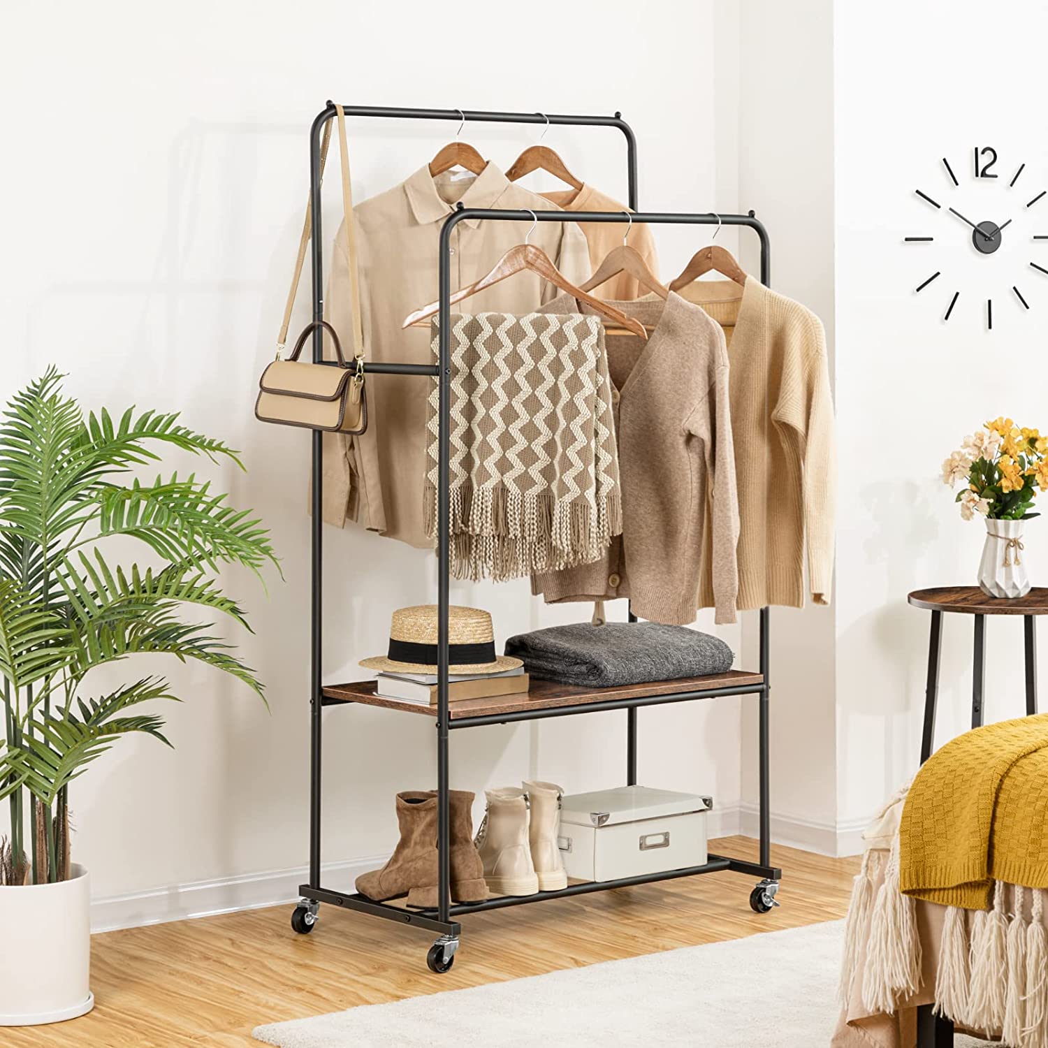 Large Capacity: Sized in 33”L x 17.9”W x 61.2”H, the 2-tier clothing rack is perfect for your daily or seasonal clothing. Hanging bars on both sides add extra storage space to hang your scarves and towels. Bottom storage are great for keeping shoes and storage boxes organized.