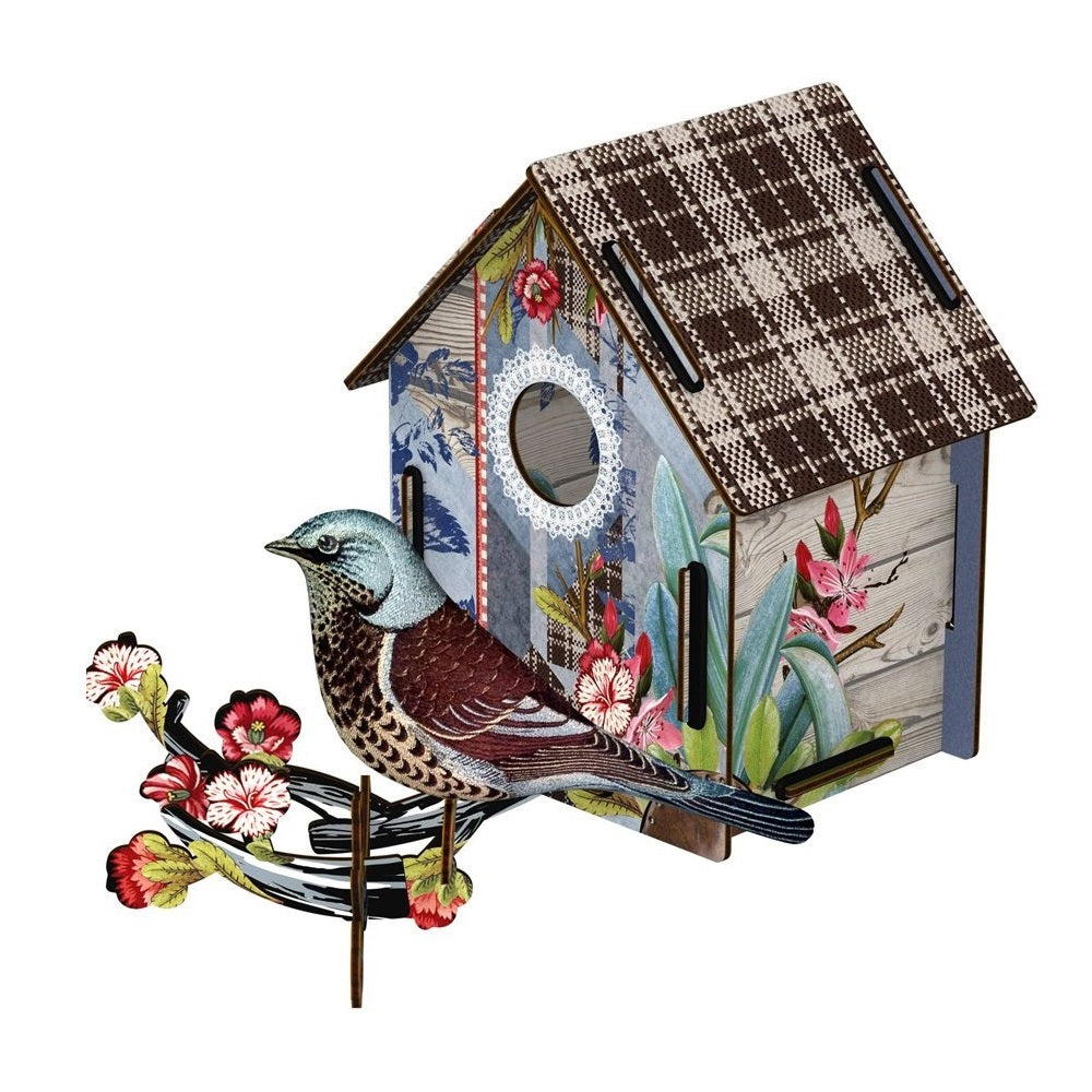 A charming fieldfare has found his shelter in this richly decorated birdhouse; he's so beautifully crafted you imagine he may fly away at any moment.