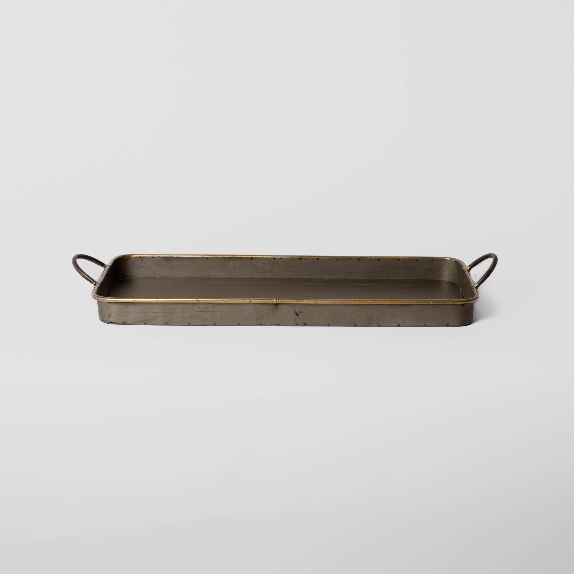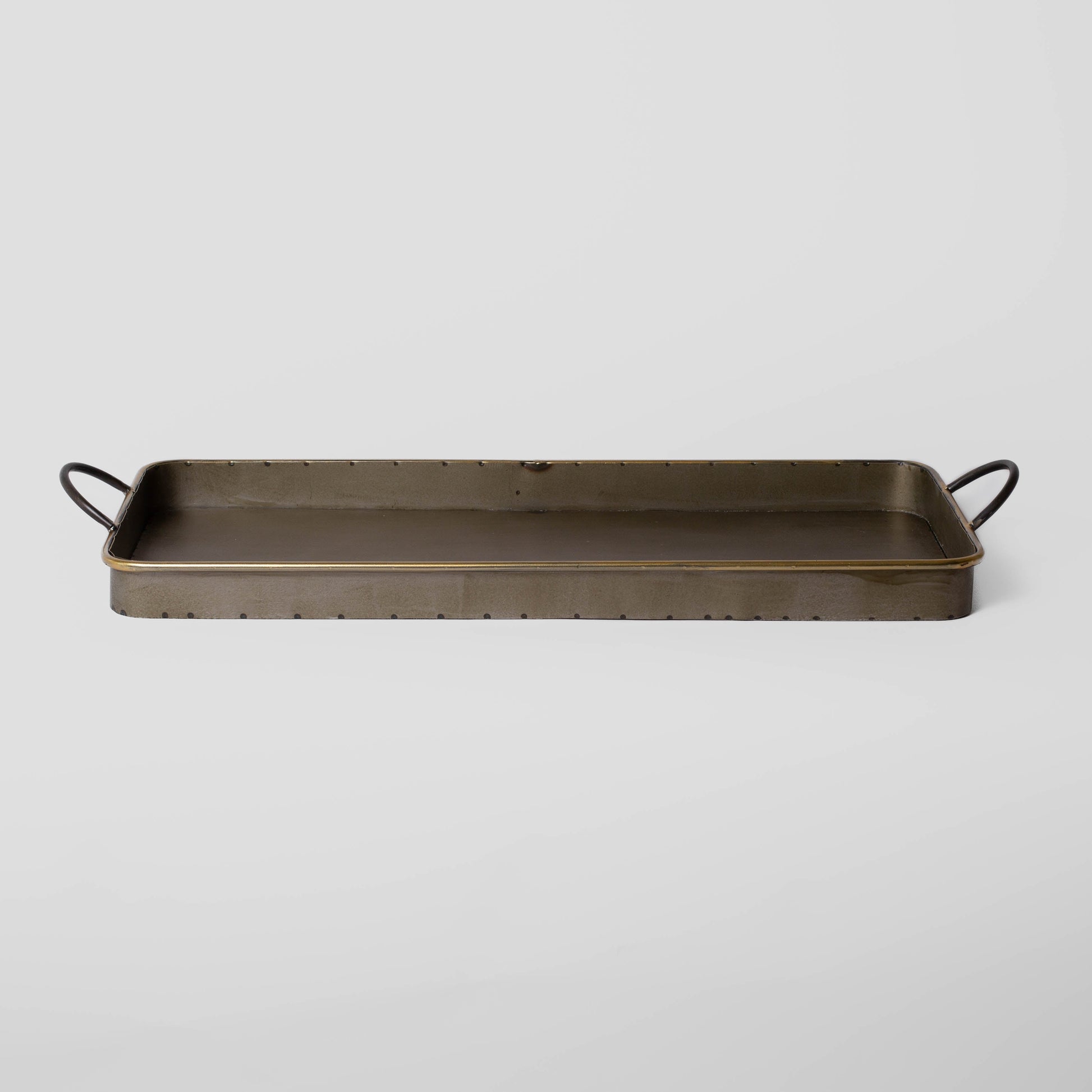 The simple design of the Galvanized Tray features a rim and functional handles. The subtle brass finish gives the tray a hint of glamour. Use on a bar cart, ottoman, or as a single serving tray.