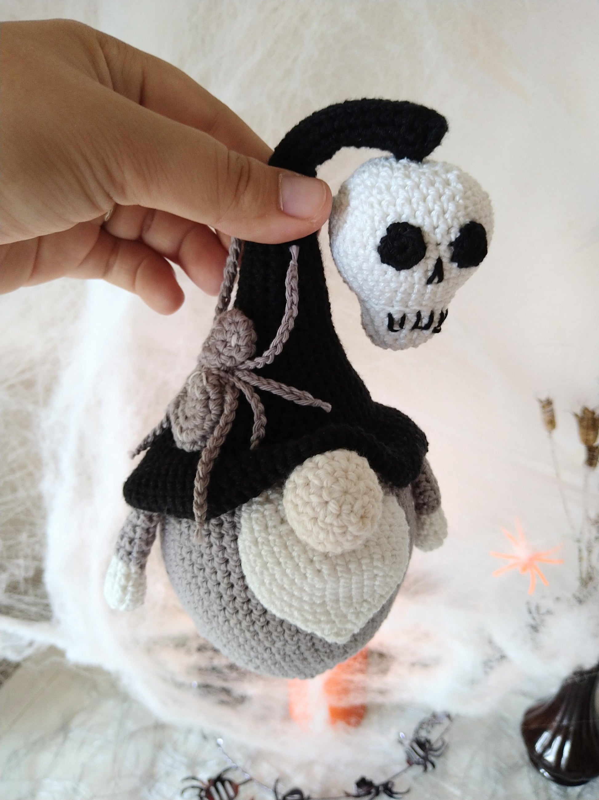 Bring Halloween spirit to your home with the help of this crocheted gnome with a scull and a spider!