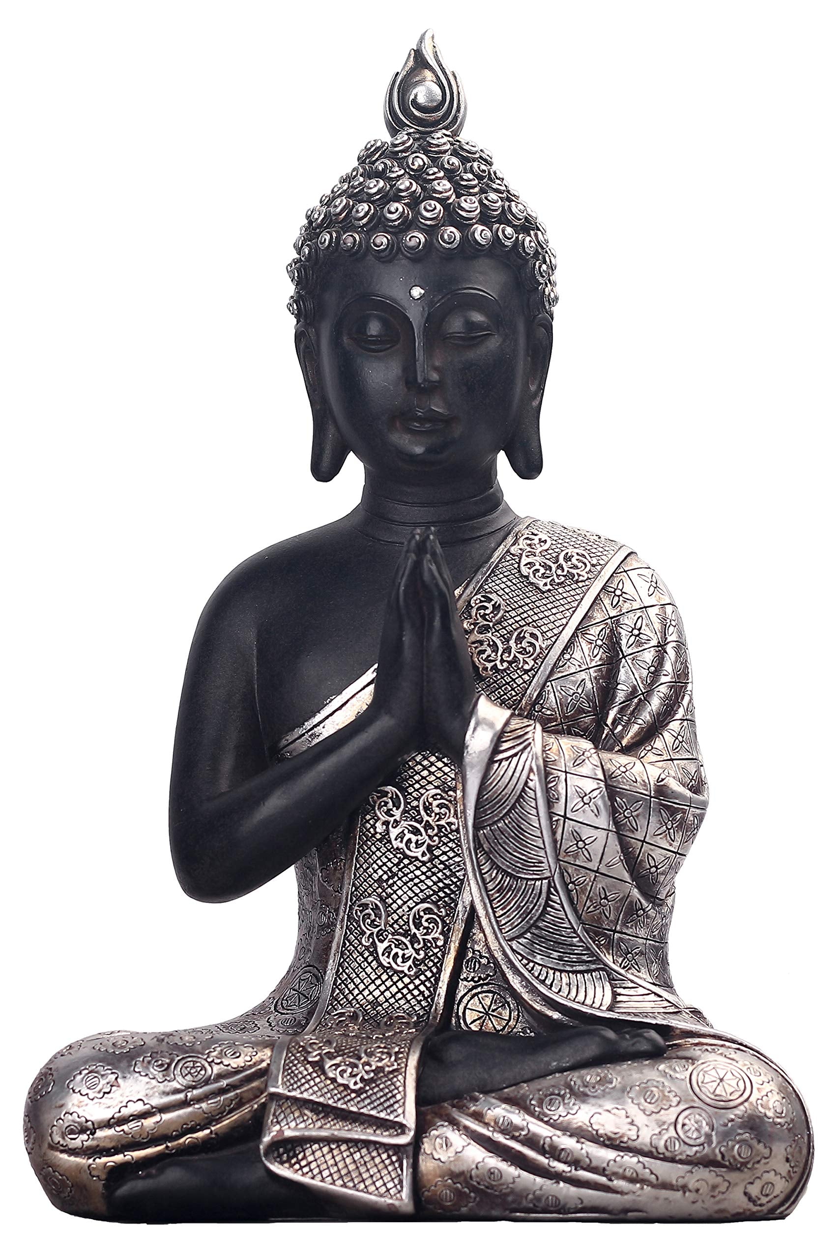 - Eyes closed smiling Buddha in lotus pose with folded hands and crossed legs has an antiqued silver finished robes with etched flourish and floral patterns, it adds ornate designs throughout the garb, silver-finish headdress with flame finial, contrasted by the black finished body.