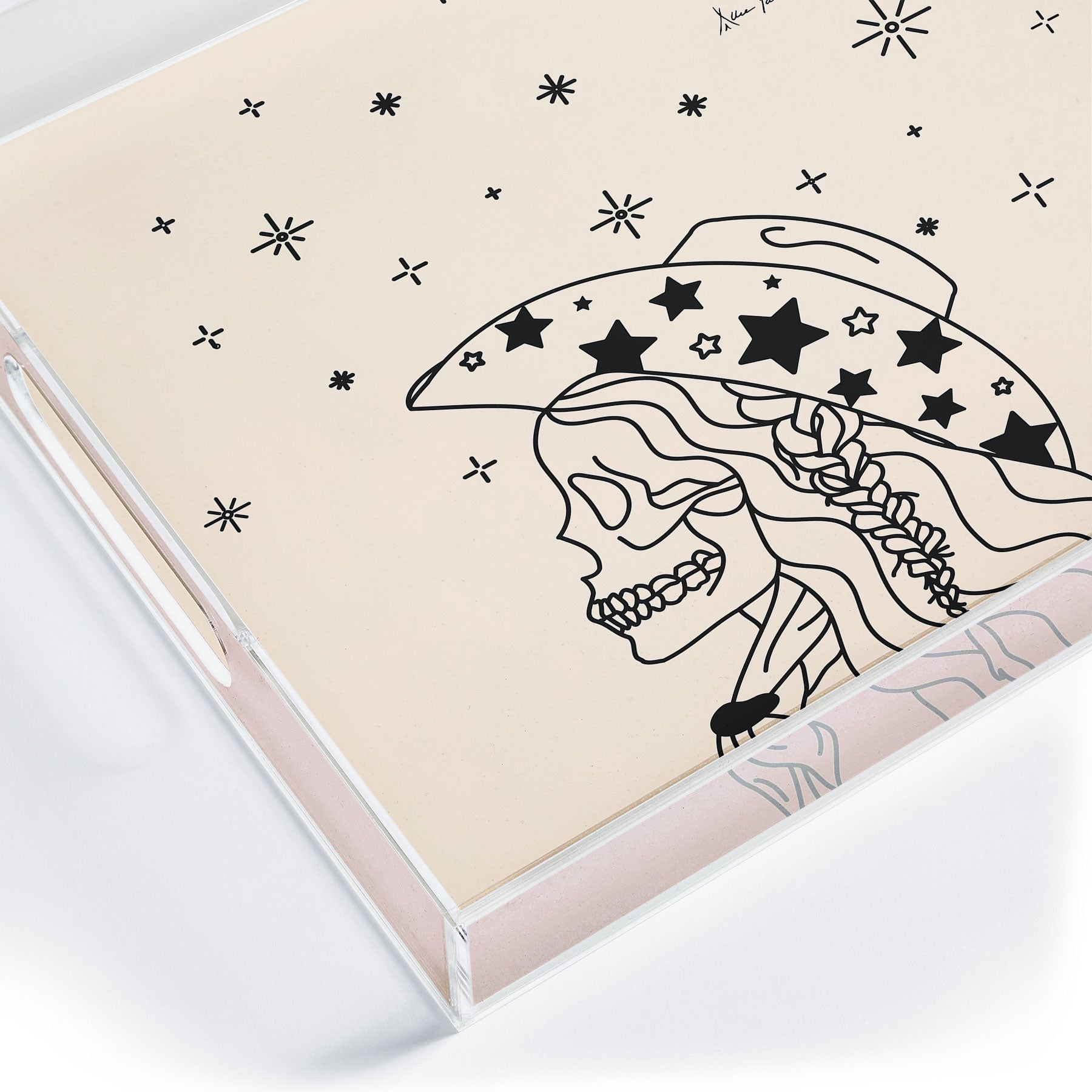 Tray chic. The Love Or Die Tryin acrylic tray come in a small and medium-size to accommodate all your countertop organizational needs. Featuring designs from our curated selection on the bottom panel, the acrylic trays can adapt to whatever decor style you love and the see-through side panels give them a modern flair. The medium-sized tray even comes with handles, allowing you to take it around the house for nail supplies or, dare we say, breakfast in bed! And the best part? Every purchase pays the artist who designed it—supporting creativity worldwide.
