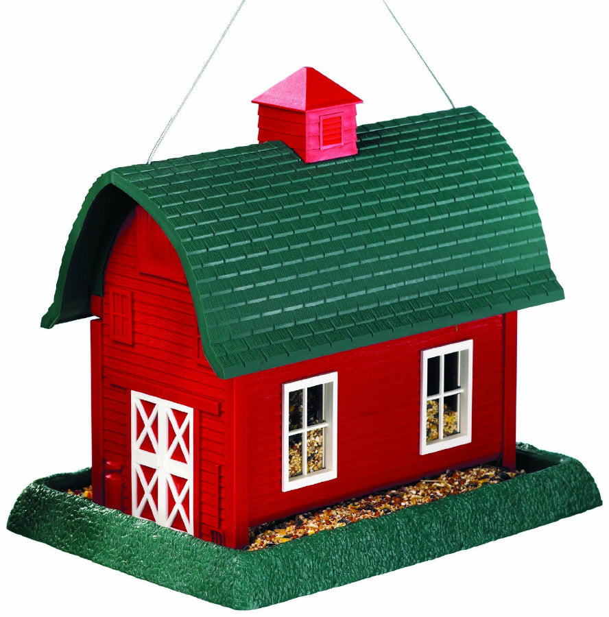 The Large Red Barn birdfeeder is part of an extensive Village Collection of feeders. This feeder is reminiscent of a country red barn with white accents and a green roof. Meausuring 14.5 x 10.5 x 11.5 inches high, this feeder has the capacity to hold 8 lbs. of seed. For monitoring seed levels, its windows are framed with clear plastic panes. The roof contains a lift-off cupola to make filling this feeder a breeze.
