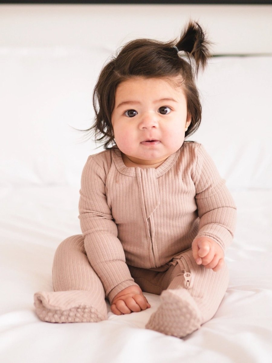 This delightful organic footie is the perfect mix of softness and practicality. With a top-to-bottom zipper for quick diaper changes and the option for fold-over mittens, it's both cute and efficient. Handmuffs for newborns to 3-6m, foot grips for 6-12m to 18-24m sizes.