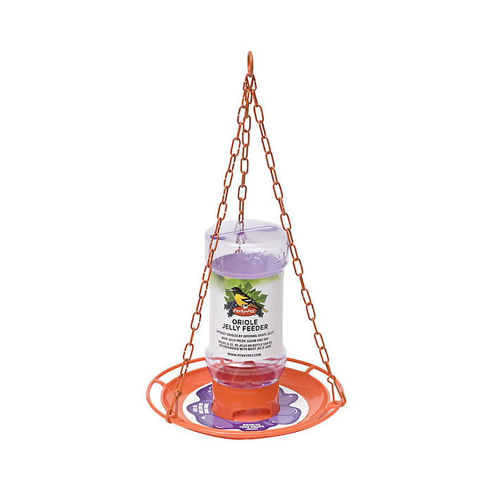 - With the Perky-Pet® Oriole Jelly Feeder, you can have ultimate flexibility in placement thanks to the built-in hanging chain and hook. Hang it anywhere around your yard, patio or garden. In addition, the chain’s sturdy metal design provides the perfect balance to the tray so it won’t tip under an oriole’s weight.