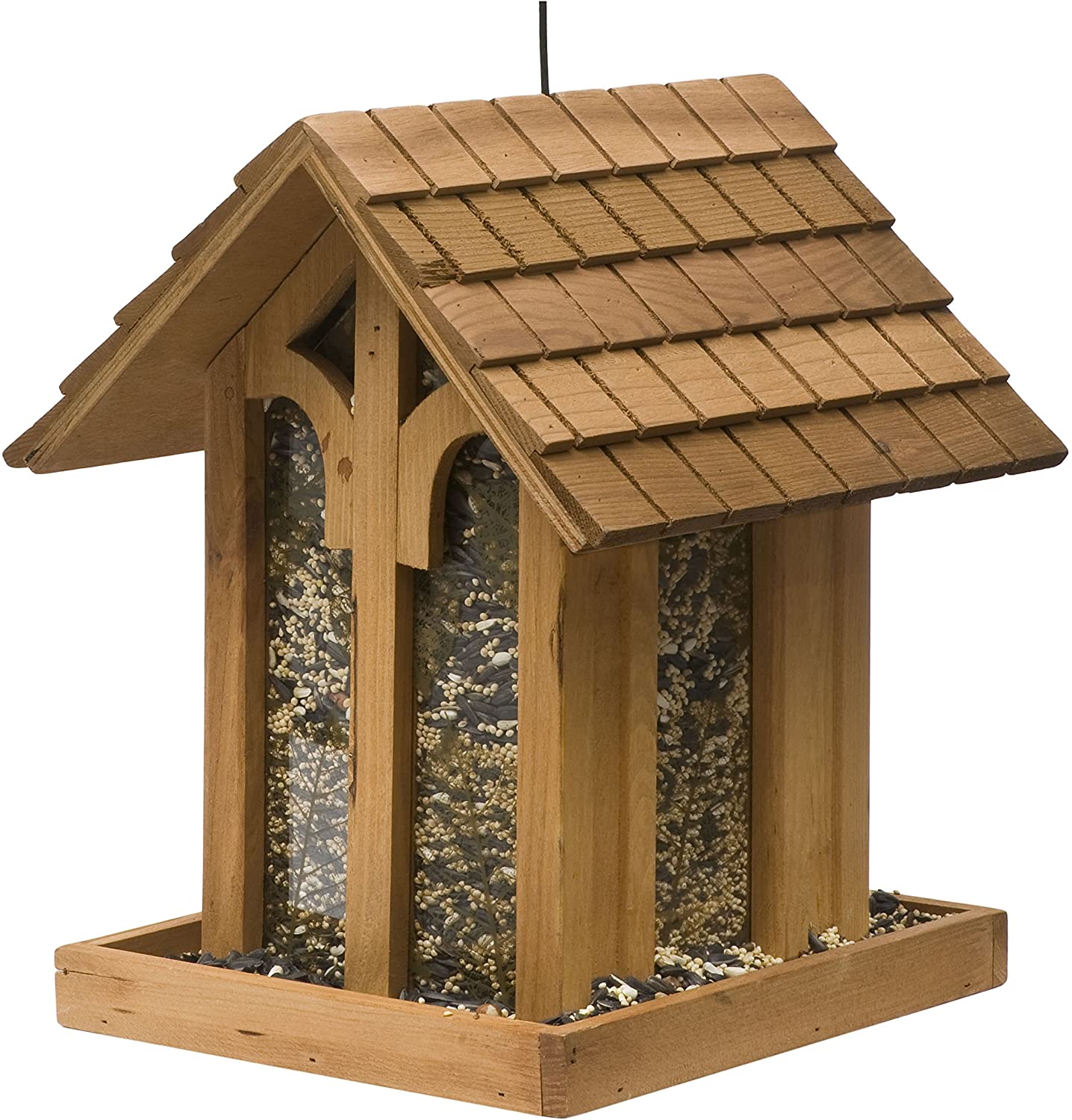 The Perky-Pet Mountain Chapel Wild Bird Feeder is sure to attract a wide variety of birds to flock to your backyard bird oasis. This wood bird feeder is constructed of Fir components. Its beautiful design is made to last, so you can enjoy feeding your feathered friends for years and years. The Mountain Chapel Wild Bird Feeder is a ideal complement to your porch, backyard or garden area. Easily fill this feeder with up to 3.5 lb of black oil sunflower seed or mixed seed, place in a quiet and convenient place and watch as multiple birds come to feast from the large seed catching tray. This elegant wood feeder has a natural design with gorgeous leaf print windows. These transparent seed compartment windows make it easy to monitor seed levels and keep your wooden bird feeder clean. This feeder will draw chickadees, grosbeaks, cardinals, nuthatches, jays, woodpeckers, Finches and a variety of other birds.