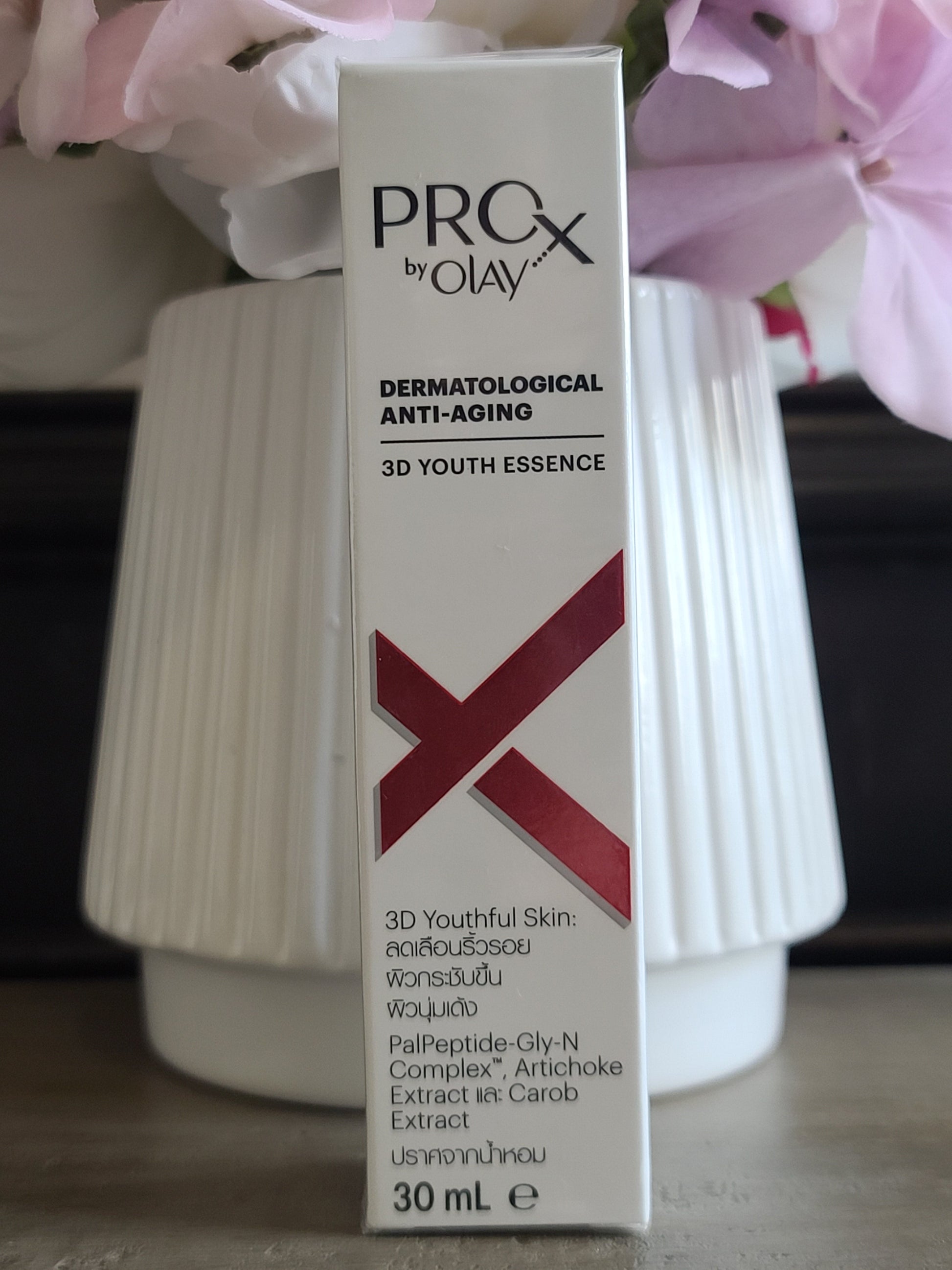 ProX By Olay Anti-aging 3D Youth Essence Serum is a serum that hydrates to sculpt and firm up skin for a bouncy feel while reducing look of persistent wrinkles. Leaves skin feeling supple after one use. PalPeptide-Gly-N Complex with artichoke and carob extract. 0% added fragrance.
