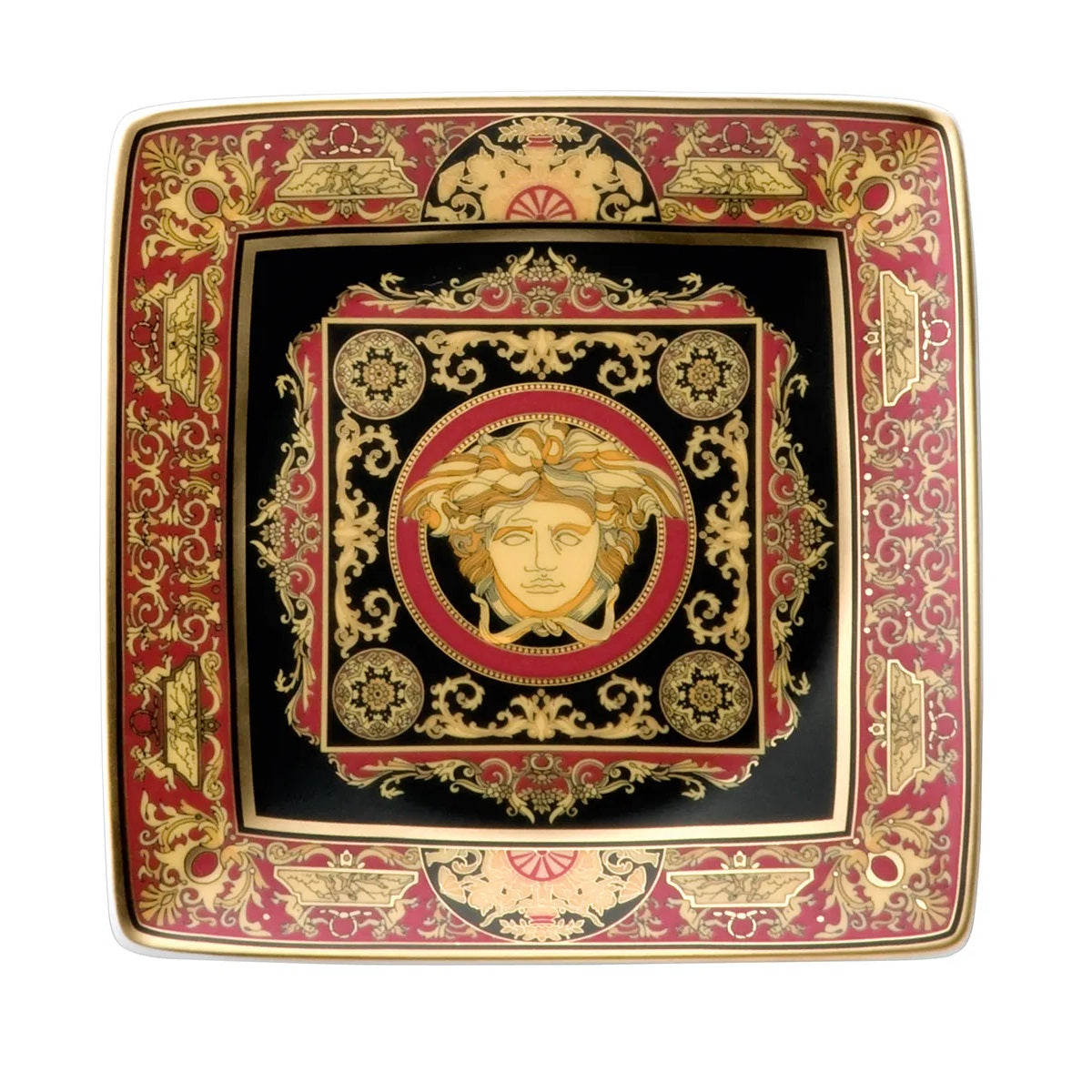 This fine Versace dinnerware is called Medusa Red. It is produced using the finest porcelain creating a style that is best described as luxurious and glamorous. The most prominent color of this item is red. Lavish ornaments decorate this piece and make it a 'must have' for everyone in love with opulent design.