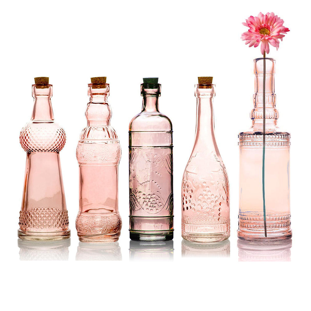 Royal Flush Pink Vintage Glass Bottles Set - (5 Pack, Assorted Designs)