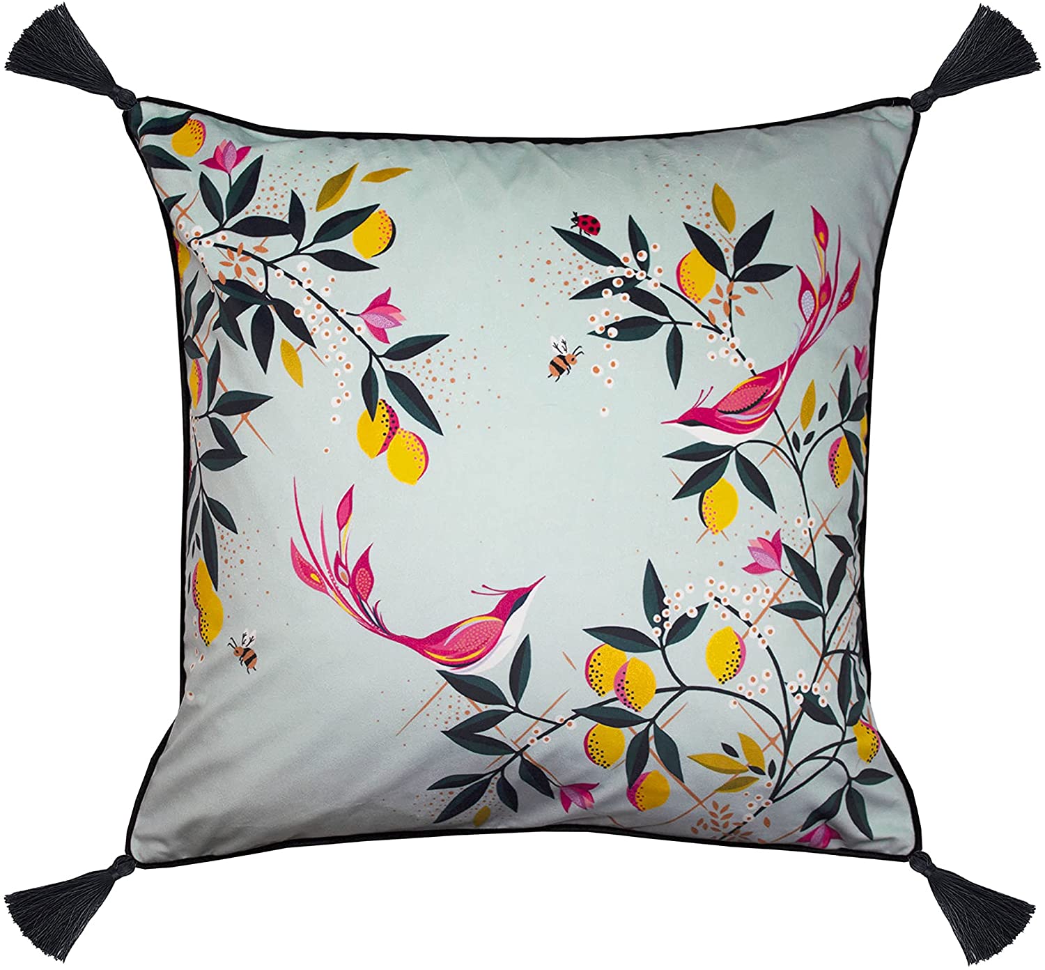 Lovely Duck Egg Bird filled cushion from the Sara Miller London collection. Featuring songbirds settled in an orchard of luscious lemon trees, this fresh and uplifting design will bring any room to life. Perfectly finished with stylish black piping and corner tassel details, this cushion is the ideal accessory to complement your decor.