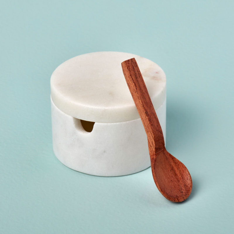 The White Marble Lidded Cellar with Wood Spoon adds beauty to your spice storage.